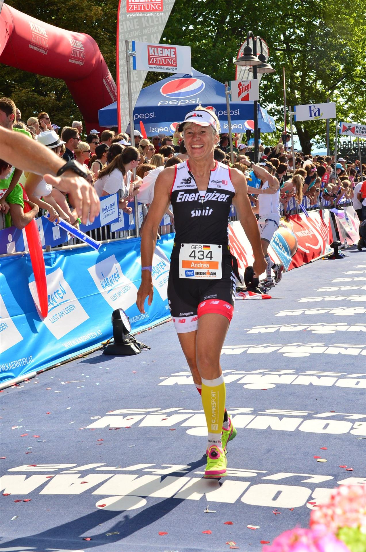 Nach insgesamt 10:49:40 Stunden durchlaufe ich als zweite in meiner Altersklasse W50, mit dem berühmten Satz YOU ARE AN IRONMAN das Ziel in Klagenfurt.