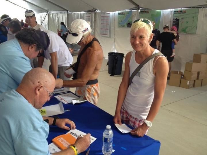 Heute Morgen gab es noch einmal eine kleine Radausfahrt. Da ich nicht mehr so viel machen wollte bin ich alleine gefahren. Um 6:30 Uhr ging es los, 30 Minuten in Richtung Wüste und wieder zurück. Erstaunlich wieviele Leute bereits um diese Zeit unterwegs sind. Die Temperaturen sind noch sehr angenehm. Nach der Radausfahrt gibt es wieder ein gemütliches Frühstück und um 10:00 Uhr fahren wir mit dem Bus zum Henderson Park. Hier ist die zweite Wechselzone eingerichtet und der Zieleinlauf ist ebenfalls dort. Das Einchecken geht relativ flott, die Leute sind super freundlich. Nach dem Einchecken machen wir noch einen Rundgang über die Messe. Es sind alle bekannten Marken vertreten, jeder zeigt seine neusten Waren.
