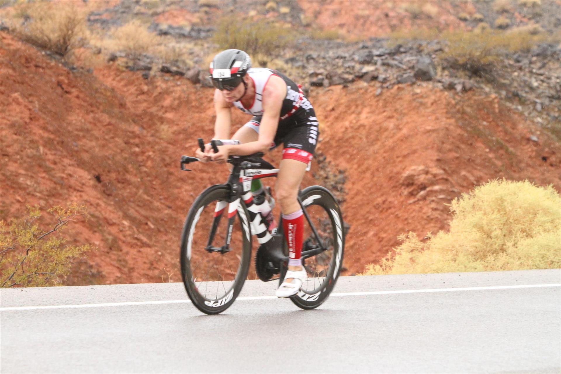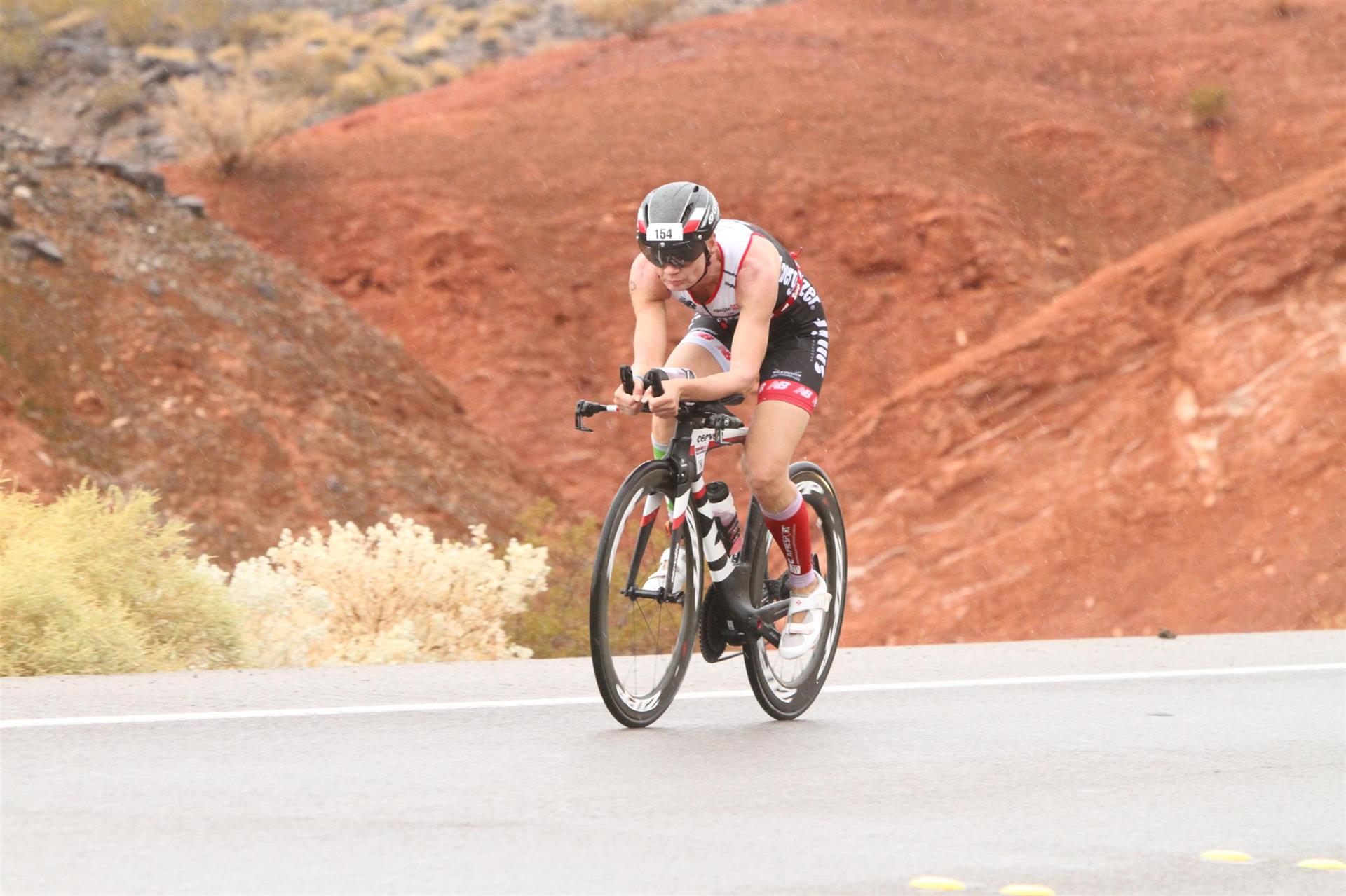 Um 6.30 Uhr gehen dann die männlichen Pros an den Start. 4 Minuten später die Profi-Frauen. Die nächste Startgruppe sind die Frauen 50+, also meine Startgruppe. Pünktlich um 6.38 Uhr fällt der Startschuss. Das Wasser ist total braun von Sand und Schlamm, man kann die Hand nicht vor den Augen sehen. Die Schwimmstrecke ist relativ einfach. Einfach einmal in eine Richtung und wieder zurück. Vom Schwimmausstieg bis zur Radwechselzone ist ein langer Weg. Das Schwimmen war okay für mich, wobei ich etwas erstaunt über meine relativ schlechte Zeit bin. Nach einigen Gesprächen mit anderen Athleten zeigt sich, dass viele auch länger geschwommen sind. Evtl. war die Strecke etwas länger, aber egal, jeder musste ja die gleiche Strecke zurücklegen. In der Wechselzone schnell die Radbekleidung an und in Richtung Ausgang. Der Weg auf die Radstrecke ist auch etwas anders. Es geht ein kleiner schmaler Weg steil nach oben. Da ich bereits meine Radschuhe anhabe ist das relativ mühsam. Meine Waden "explodieren" fast. Auf dem Rad habe ich teilweise Probleme mit den Waden. Es schüttet weiterhin furchtbar, man kann froh sein, dass es wenigstens warm ist. Zuerst fahren wir ein Quadrat und danach geht es in Richtung Wüste in den Nationalpark. Teilweise sind riesige Pfützen auf der Strasse. Es regnet weiterhin Bindfäden, ich bin etwas vorsichtig bei diesem Wetter. Die Radstrecke ist nicht komplett gesperrt, teilweise fahren Autos, für eine Weltmeisterschaft doch sehr ungewöhnlich. Die Strecke ist wellig, es sind lediglich kleine Hügel, keine richtigen Berge. Diese kurzen Steigungen sind jedoch nicht ohne. Ich fahre mein Tempo und mache mich nicht verrückt. Inzwischen hat man sich an den Regen gewöhnt, die Füße sind etwas kalt, bei den Abfahrten ist es teilweise etwas frisch. Nach ca. 70 Kilometern klart es auf, der Regen hört endlich auf. Die letzten 20 Kilometer gehen in Richtung Las Vegas nach Henderson. In der 2. Wechselzone bekommt man das Rad abgenommen und den Runbeutel gereicht. Schnell ins Wechselzelt umziehen und auf die Laufstrecke. Insgesamt müssen 3 Runden mit jeweils 50 Höhenmeter gelaufen werden, also insgesamt 150 Höhenmeter. Am Anfang geht es ca. 1 bis 1,5 km leicht nach unten, diese Strecke muss man auch wieder hoch laufen. Anschließend geht es an der Wechselzone vorbei und dann kommt ein langer Anstieg. Auf der ersten Runde habe ich ganz schön Probleme mit dieser Steigung. Es fällt mir sehr schwer und ich denke schon darüber nach, wie ich diese Strecke 3 Runden überlebe. Zurück geht es dann angenehm nach unten und meinen Beinen geht es etwas besser. Inzwischen ist auch die Sonne raus gekommen, es ist jetzt deutlich wärmer. Die Versorgung auf der Laufstrecke ist sehr gut. Es gibt ausreichend Wasser zur Kühlung sowie Iso und Cola. Ich bin froh als ich die letzte Runde vor mir habe. Es ist immer wieder erstaunlich, dass man dann doch alles schafft. Auf der ersten Runde hatte ich noch meine Zweifel, aber irgendwie funktioniert das doch. Ich bin froh als ich endlich das Ziel durchlaufen kann. Es geht mir sehr gut, meine Zeit und Platzierung sind mir in diesem Moment völlig egal. Ich habe gefinisht und bin glücklich und zufrieden.