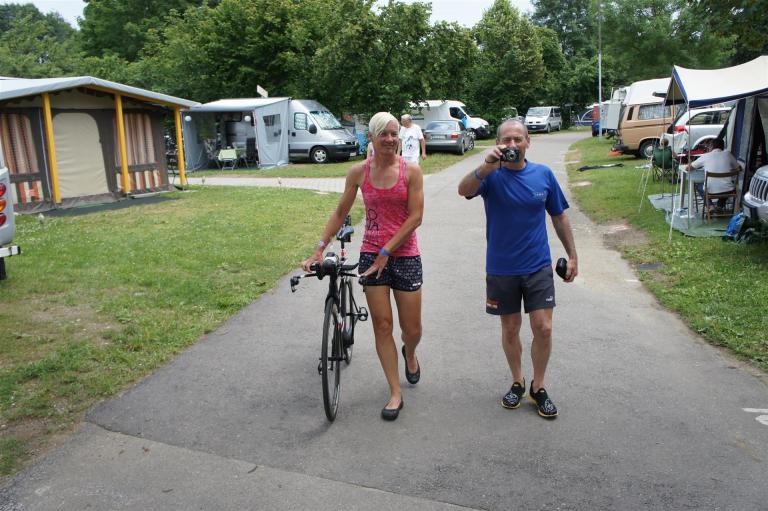 Als nächste Etappe steht dann der Anstieg zum Rupertiberg an. Der Anstieg ist etwas 2.400 Meter lang bei einer Steigung von bis zu 16 %. Auch hier haben sich sehr viele Zuschauer versammelt, das Anfeuern spornt die Athleten zu Höchstleistung an. Die letzten Kilometer der ersten Runde geht es dann überwiegend nur noch nach unten. Auf der zweiten Radrunde regnet es leider etwas, aber egal, da fährt man einfach etwas vorsichtiger. Nach 5:50 Stunden steige ich vom Rad und ziehe meine Laufschuhe an.