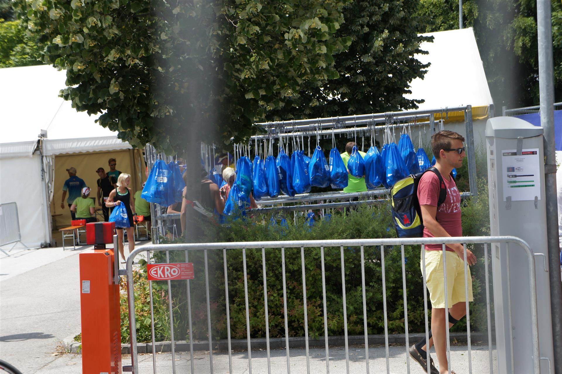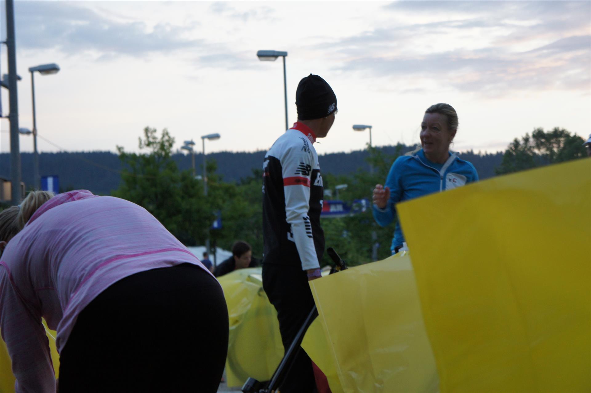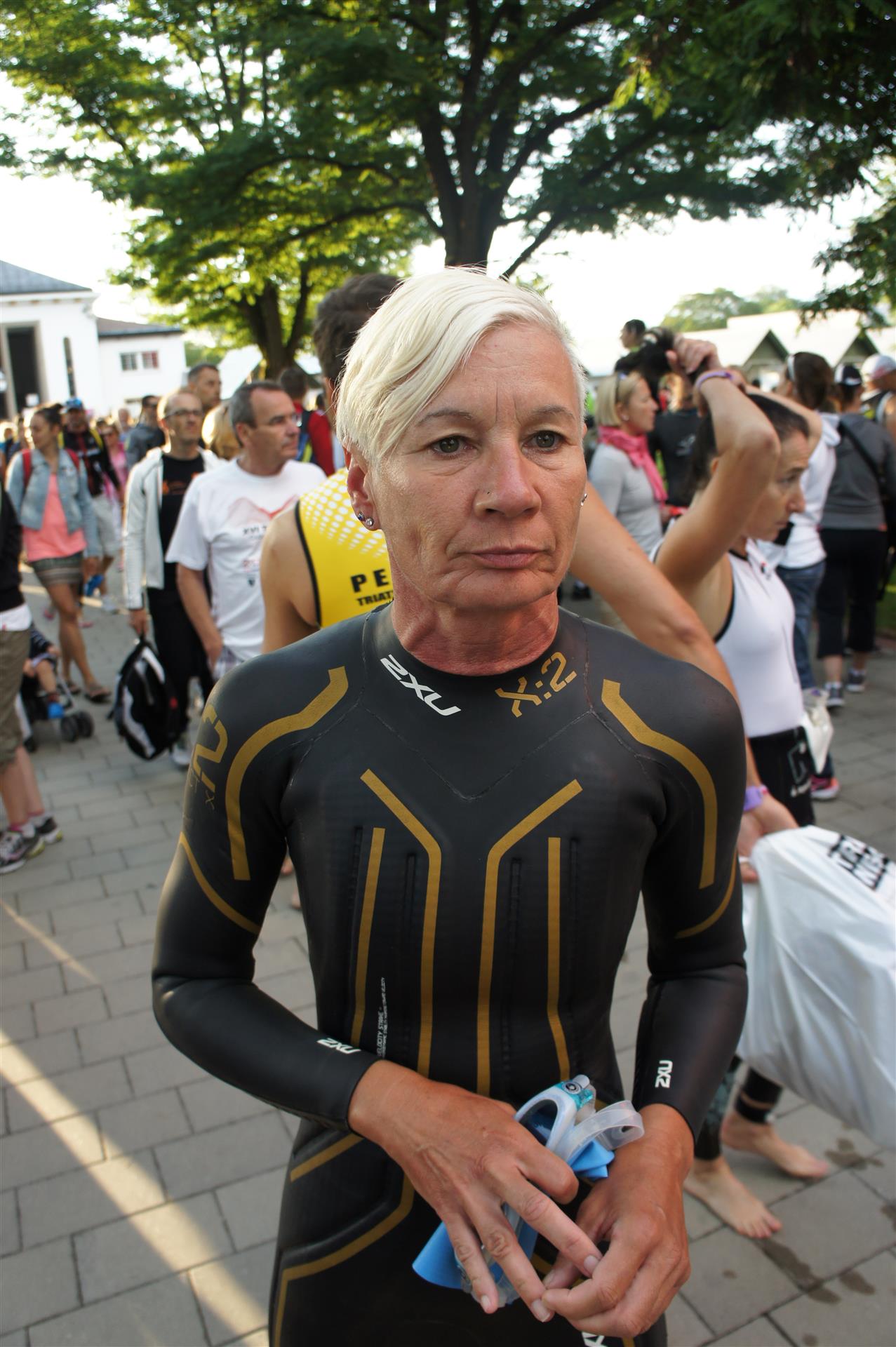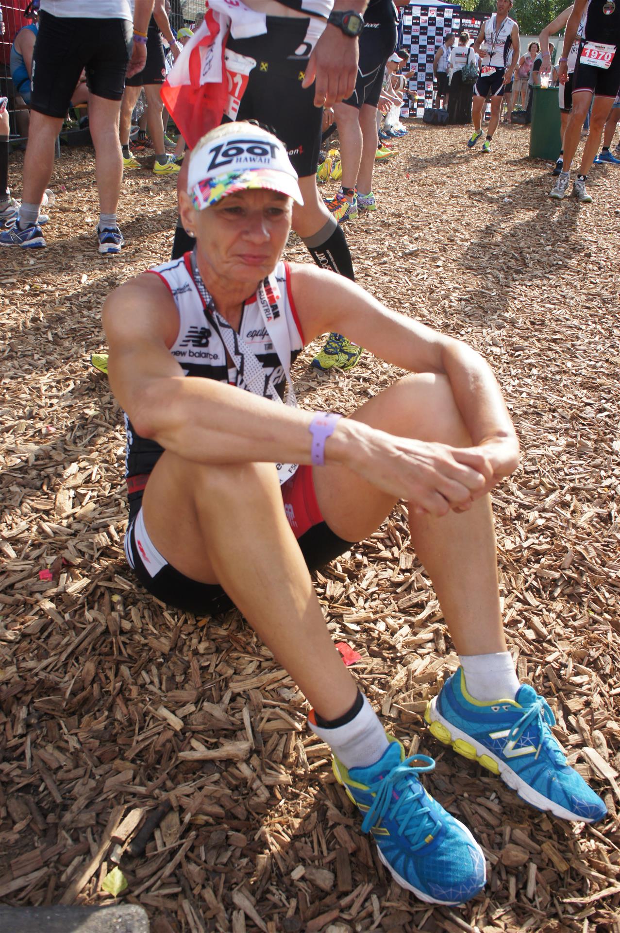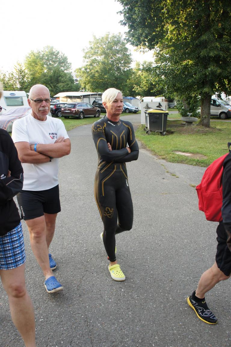 Nach einer Schwimmzeit von 1 Stunde und 11 Minuten verlasse ich das Wasser. Ich bin zufrieden mit meiner Zeit. Der Weg vom Schwimmausstieg bis in die Wechselzone ist relativ lange. Man hat ausreichend Zeit den Neoprenanzug etwas auszuziehen.