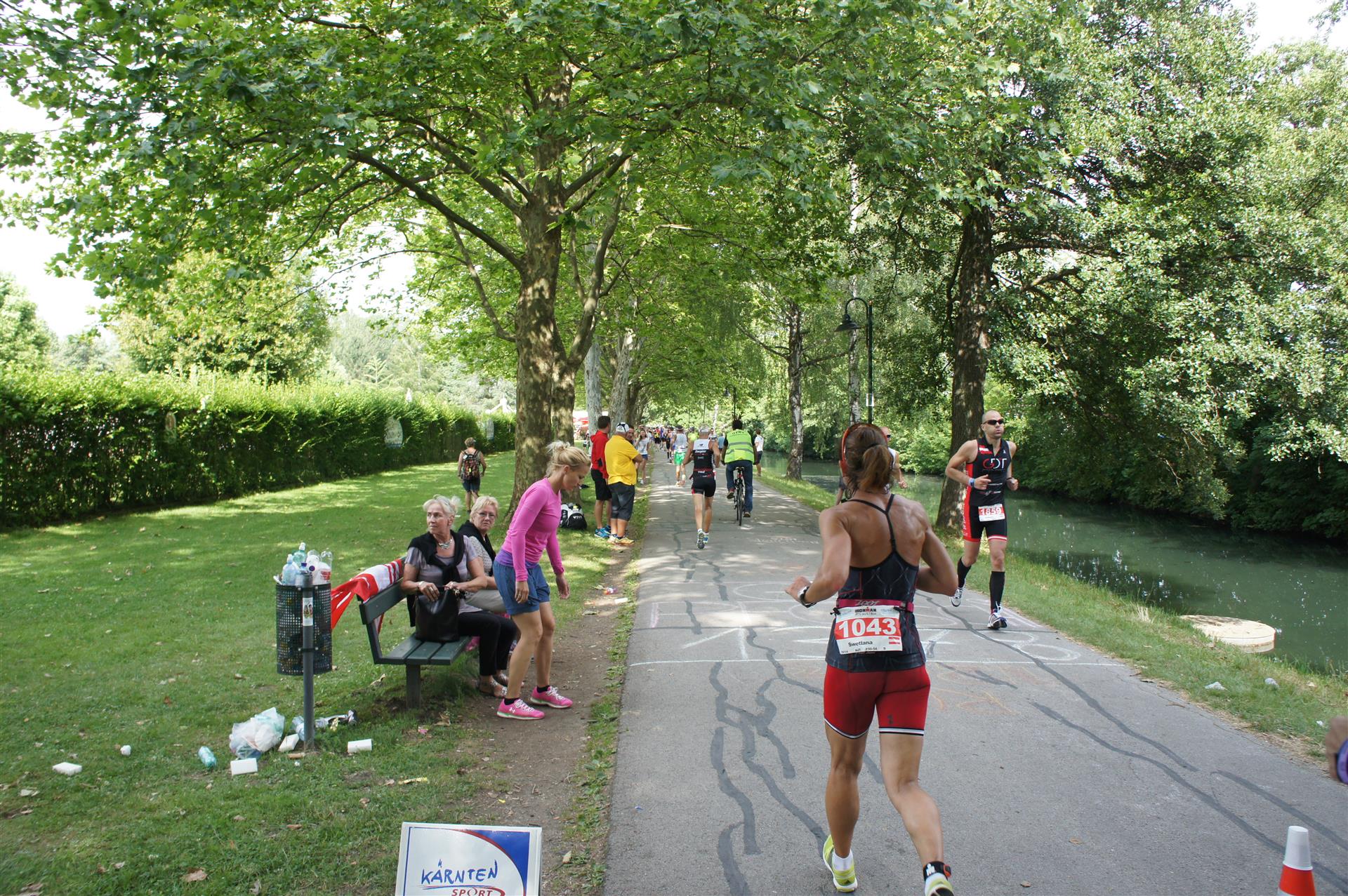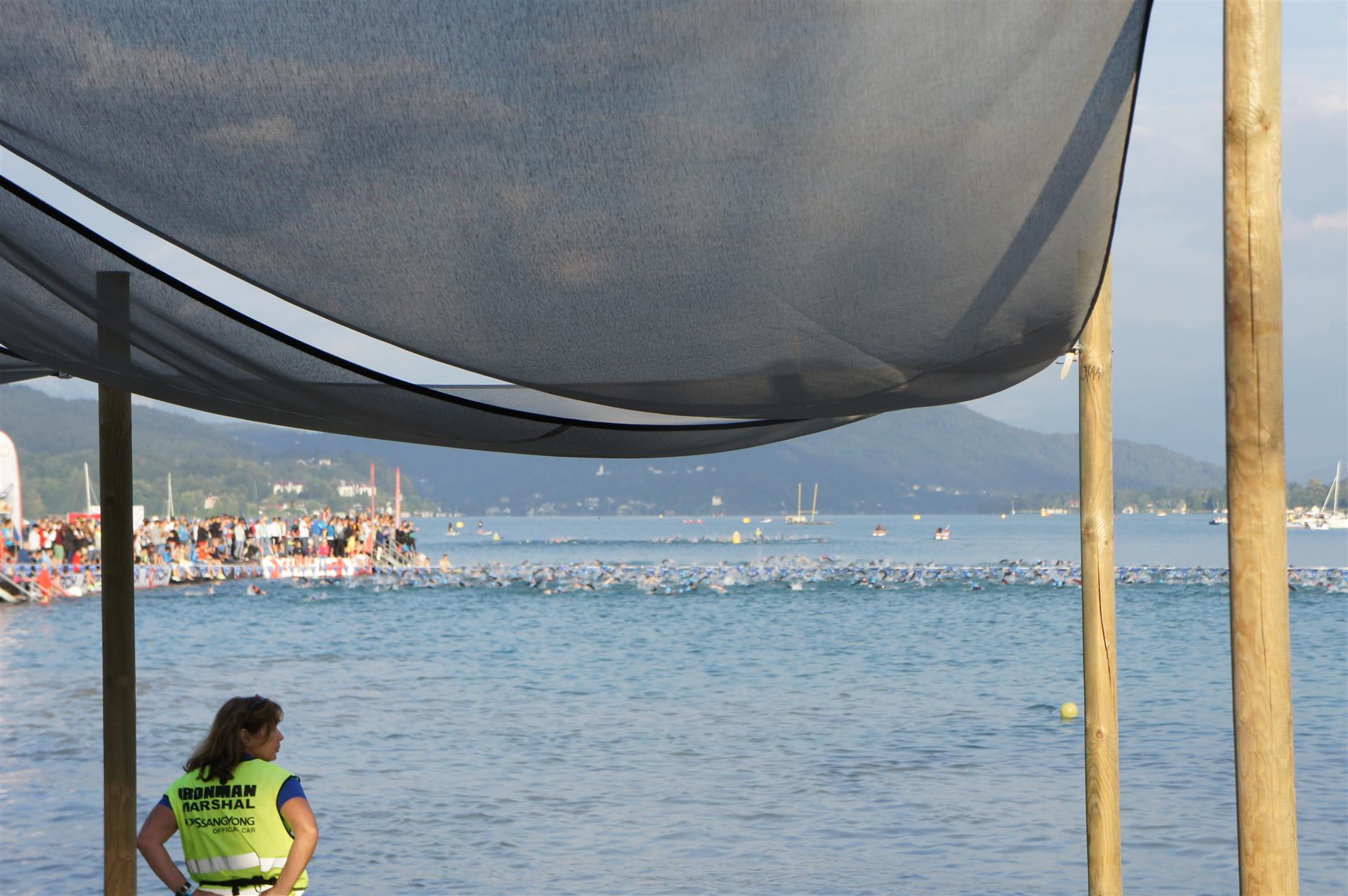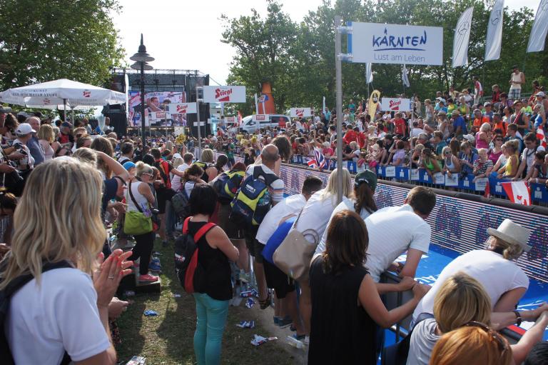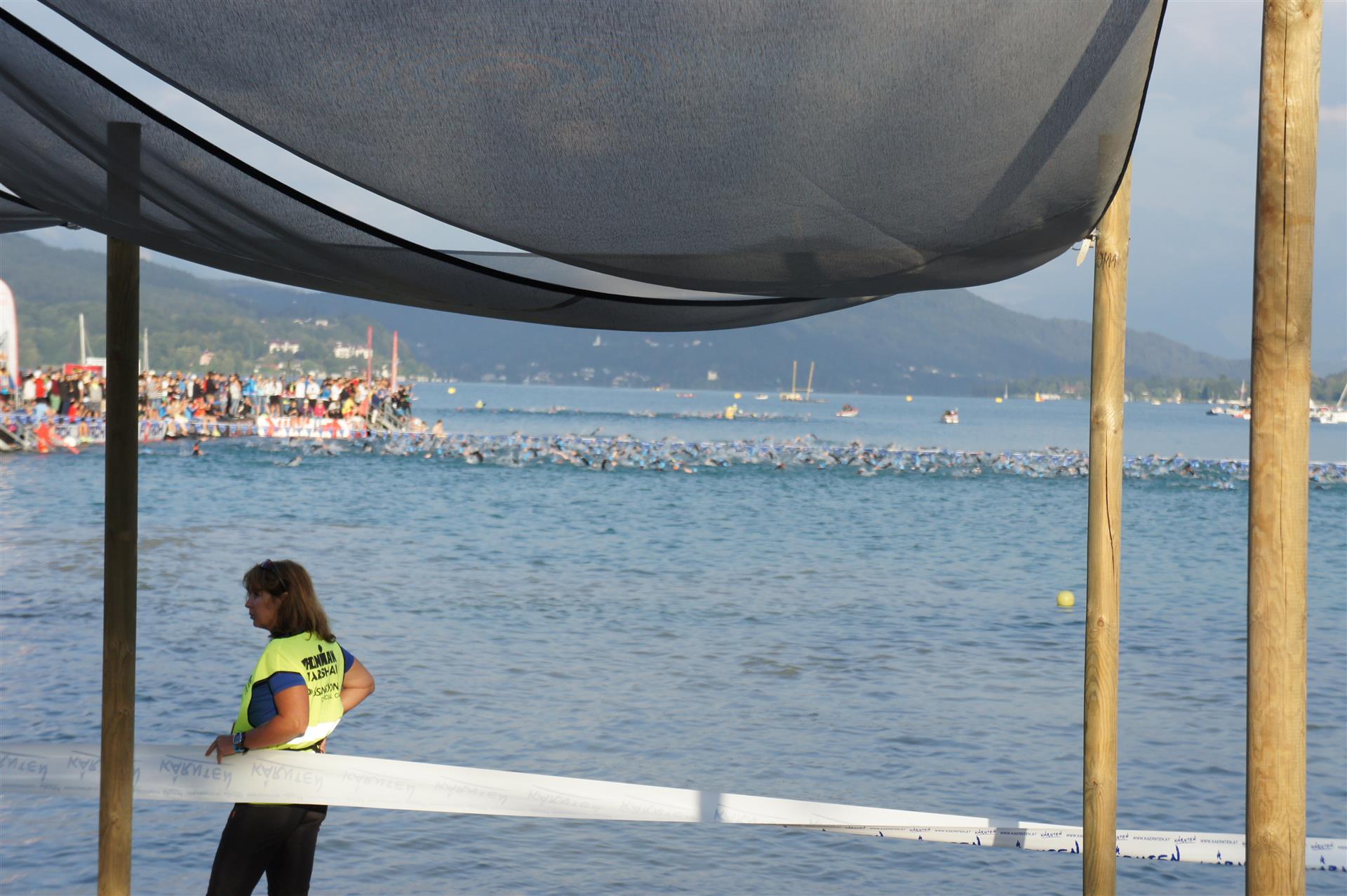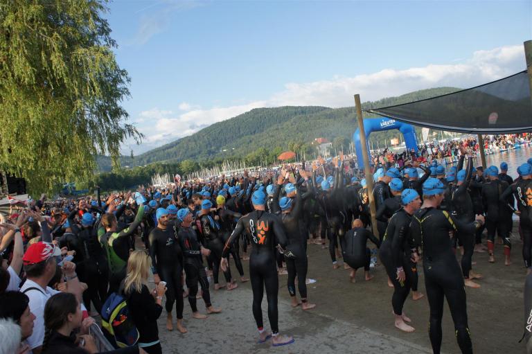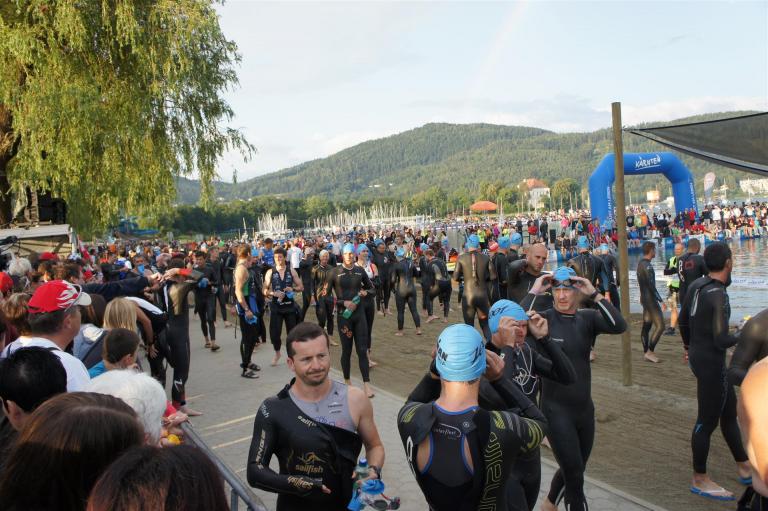 Obwohl ich lediglich eine mittelmäßige Schwimmerin bin macht mir das Schwimmen Spaß. Ich versuche meinen Rhythmus zu finden und gehe möglichst allen Konfrontationen aus dem Weg. Das Schwimmen im Wörthersee ist schon eine tolle Sache. Das Wasser ist super klar, die Strecke gut gekennzeichnet. Lediglich die letzten 1.000 Meter im Lendkanal sind etwas stressig. Wenn sich der ganze Pulk in den lediglich 10-12 Meter breiten Kanal zwängt. Da gibt es auf den ersten Metern ein ganz schönes Gedränge. Man wird jedoch durch die vielen Zuschauer am Rande des Kanals entschädigt. Die Stimmung ist gewaltig, der Krach ohrenbetäubend.