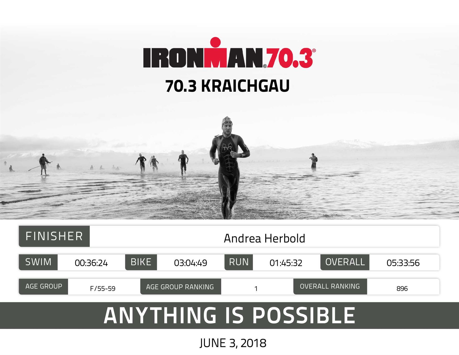 Mit diesem Platz war für mich klar, ich muss Gas geben. Trotz Hitze versuchte ich ein konstantes und zügiges Tempo zu laufen. 3 Runden a 7 Kilometer mit einigen kleinen Anstiegen und viel Sonne. Bei Temperaturen um die 30 Grad war man um jede Abkühlung dankbar. Einige Anwohner standen mit dem Gartenschlauch an der Strecke und gaben den Athleten die Möglichkeit sich etwas abzukühlen. Den Halbmarathon konnte ich in einer Zeit von 1:45:33 laufen. Nach insgesamt 5:33:56 ging ich nach einem tollen Wettkampf und einem 1. Platz in der AK 55 durchs Ziel. Ich hatte nicht damit gerechnet, solch eine Platzierung zu erreichen. Jetzt gibt es einige Tage lockeres Training und dann geht es zum Endspurt für die Langdistanz. Das teilweise sehr harte Training der letzten Wochen und Monaten hat sich definitiv bereits jetzt gelohnt.