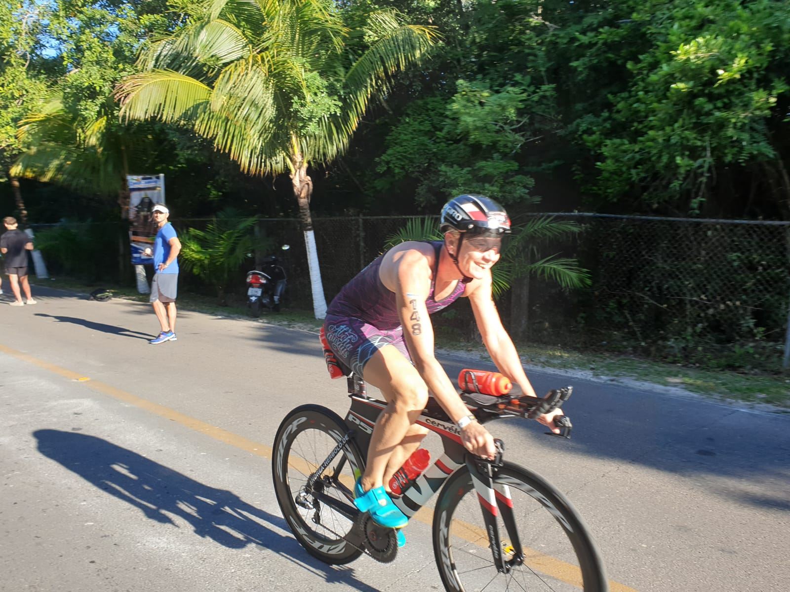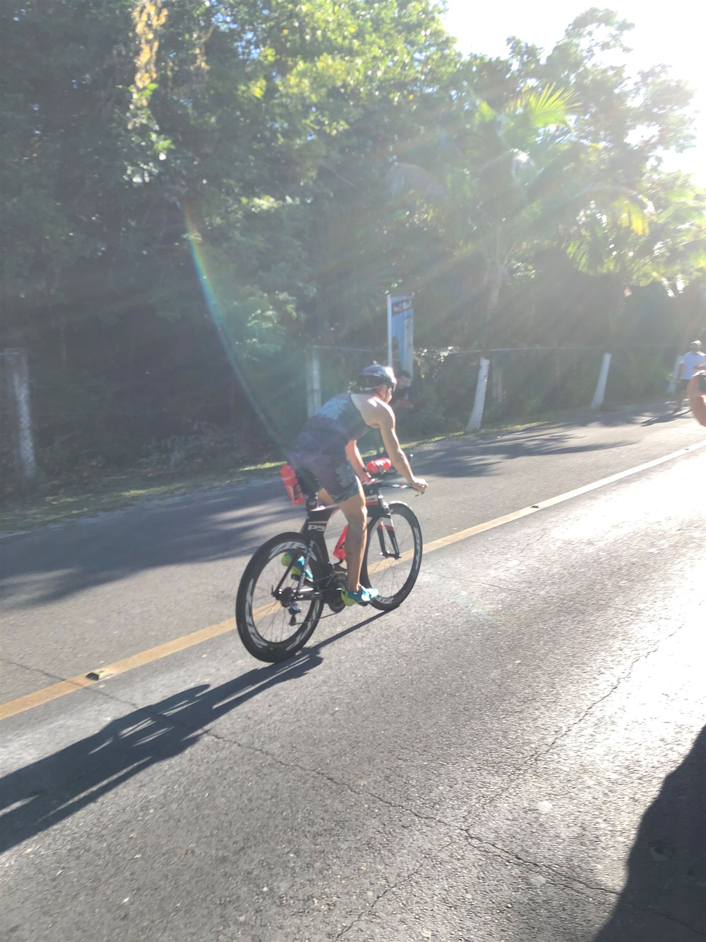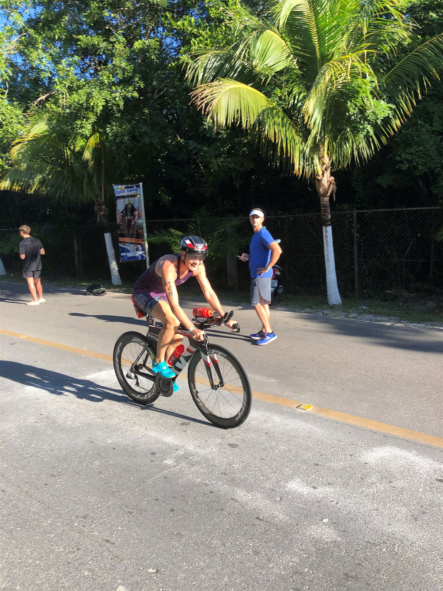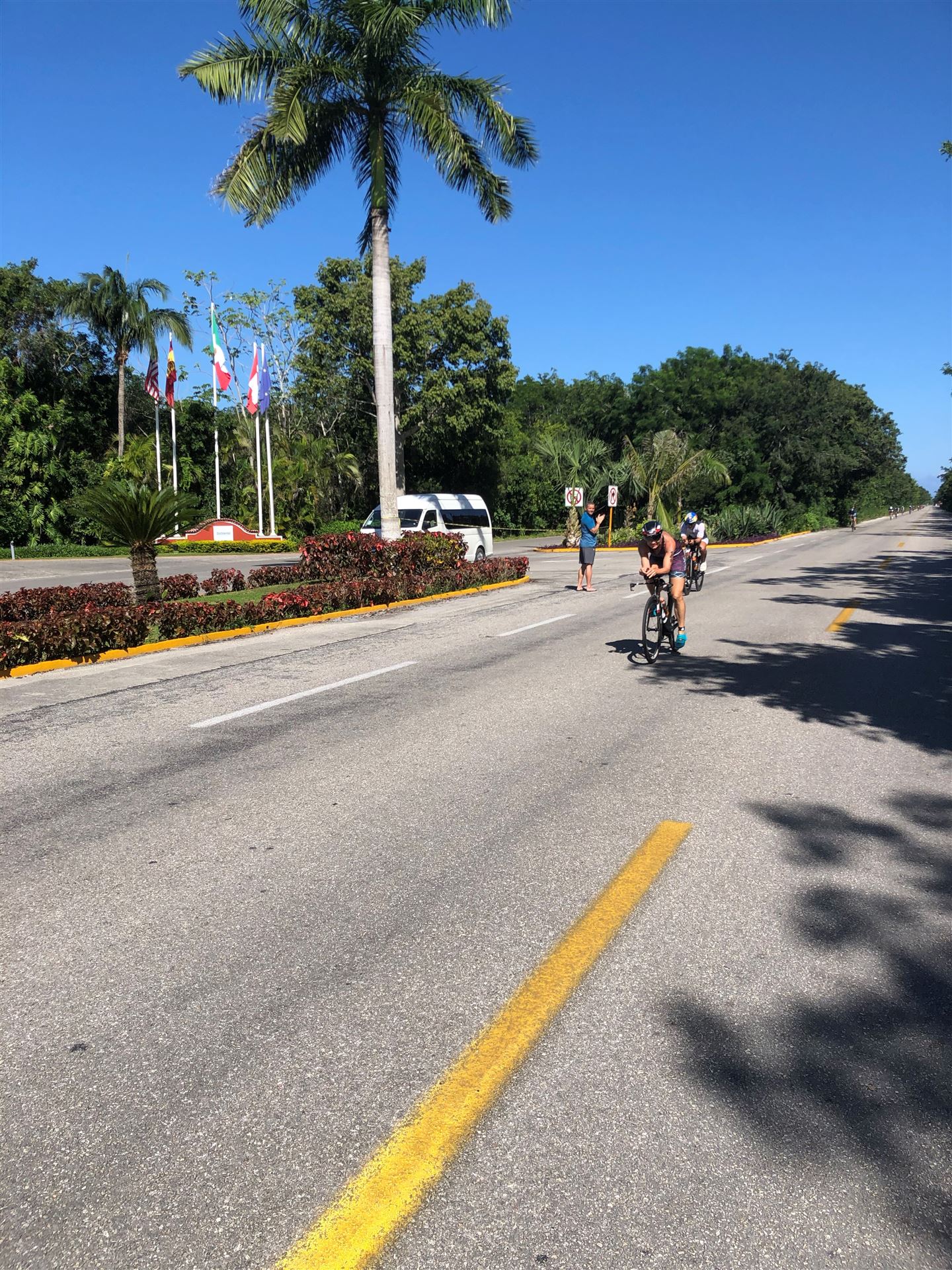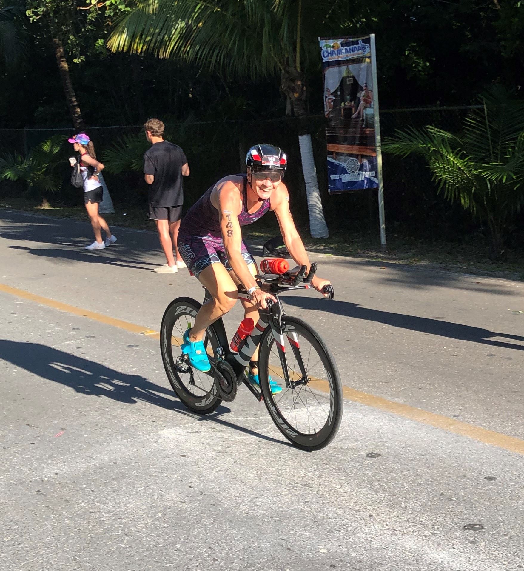 Um kurz vor 7:00 Uhr ist die Nacht vorbei. Da es relativ früh dunkel wird, steht man auch entsprechend früh auf. Nach dem Frühstück geht es mit dem Rad los. Einmal die Wettkampfstrecke abfahren, sprich einmal um die Insel. Inzwischen sind einige Athleten unterwegs. Es gibt einen tollen Radweg, der fast komplett parallel zur Straße geht. Es gibt kaum Verkehr, der Wind ist okay, die Wettkampfstrecke ohne Überraschungen. Unterwegs gibt es sogar Schilder mit dem Hinweis Athleten im Training. Eine Runde sind circa 63 Kilometer, fast alles mit Radweg. Nur das Stück durch die Stadt ist etwas blöd, der Rest jedoch perfekt. Im Anschluss an das Rad fahren stehen noch 30 Minuten lockere Grundlage Laufen auf dem Plan. Danach liegen wir etwas im Schatten am Pool. Inzwischen sind noch einige Athleten im Club angekommen. Zum Abendessen gibt es heute mal Buffet, danach noch etwas chillen und dann ab ins Bett.