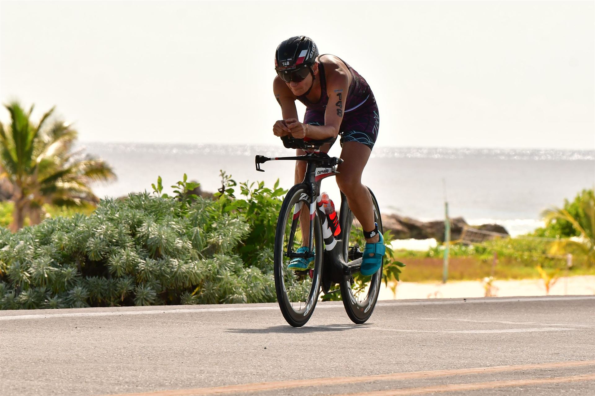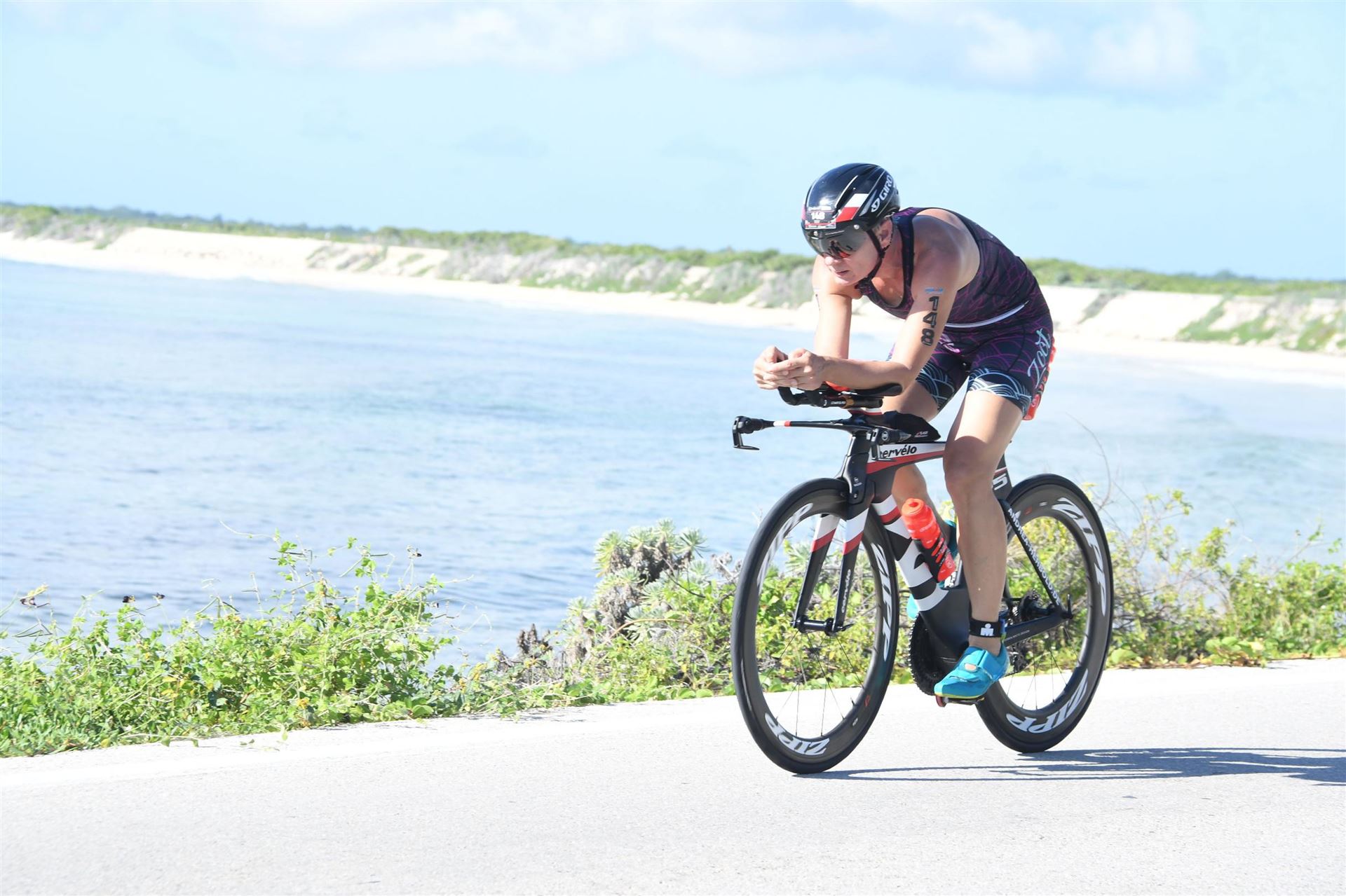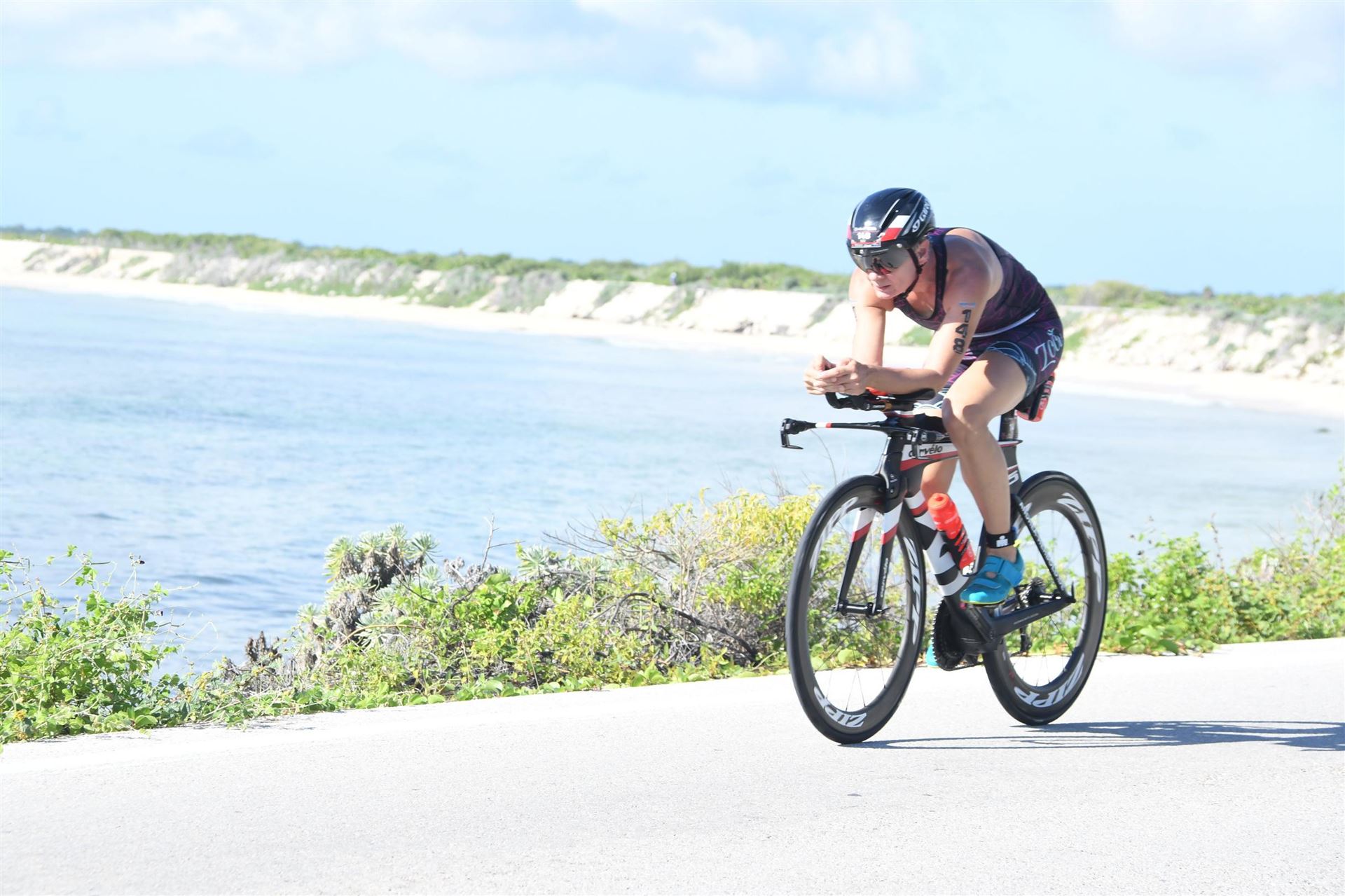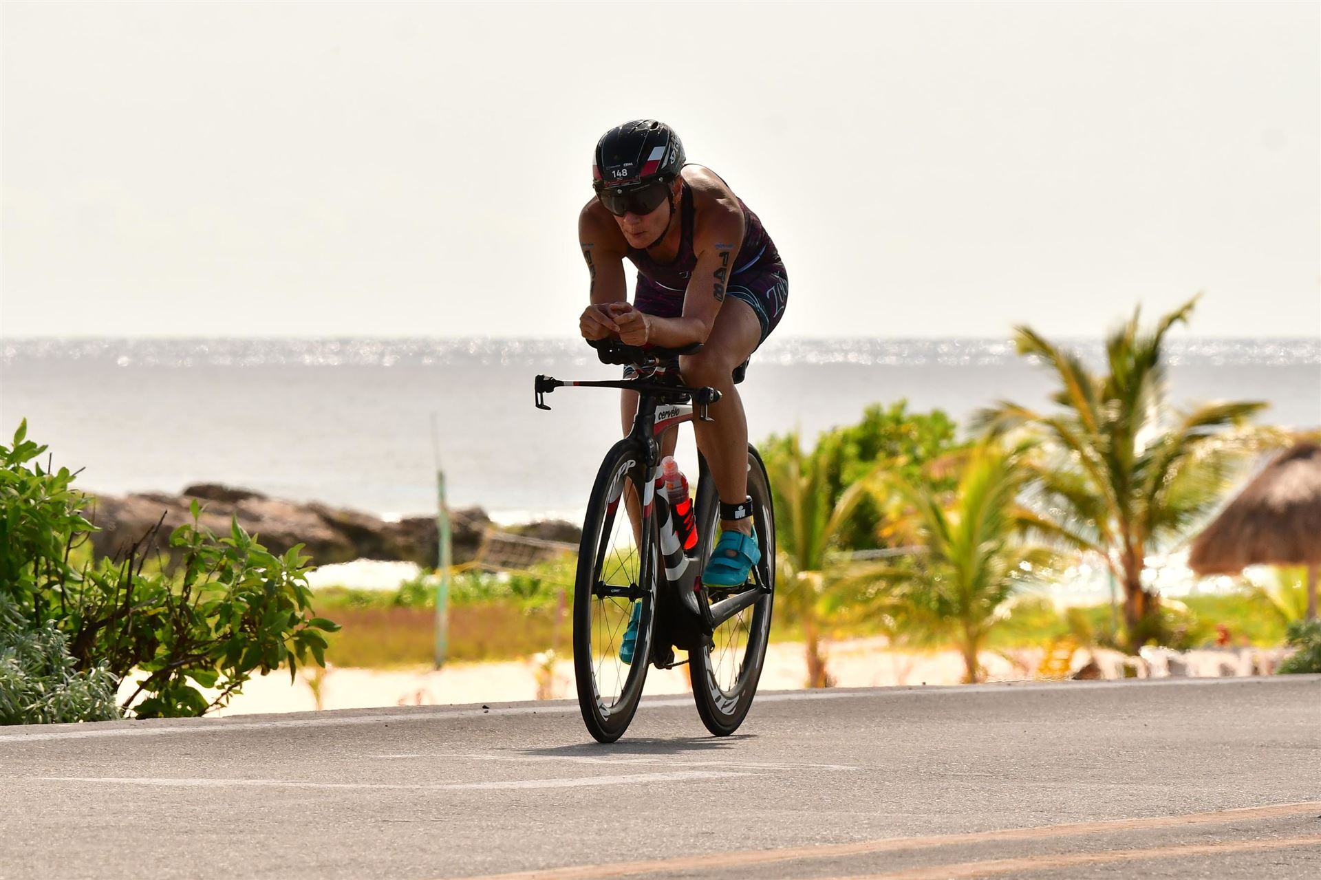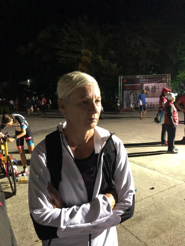 Zügig zum Rad und dann ab auf die erste Runde. Da mein Magen noch immer rebelliert verzichte ich die erste Zeit auf jegliche Nahrungs- bzw. Flüssigkeitsaufnahme. Das erste Stück geht an diversen Hotels und Restaurants vorbei. Die Strecke ist überwiegend geradeaus. Nichts spektakuläres. Ein großes Teilstück verläuft parallel zum Meer, der Ausblick ist einfach toll. Schön, wenn man während einem Rennen noch solch ein Panorama genießen kann. Am Anfang ist die Radstrecke noch etwas voll, das wird jedoch von Kilometer zu Kilometer besser. Ich fühle mich sehr gut und kann mein Tempo fahren. Ich freue mich, wenn ich den ein- oder anderen Athleten überholen kann, das bringt zusätzliche Motivation. Ich versuche die meiste Zeit abgelegt zu fahren, das minimiert den Windwiderstand. Die Verpflegungsstellen sind sehr dicht beieinander, man kann seine Flaschen auffüllen und sich mit Wasser kühlen. Ist perfekt organisiert. Insgesamt muss man 3 Runden fahren. 2 x 63 Kilometer und die letzte Runde noch 54 Kilometer. Ich versuche möglichst konstant mein Tempo zu fahren und fühle mich ausgezeichnet. Es steht ja im Anschluss noch ein Marathon an. Das Gefühl ist toll, als ich nach 3 Runden in Richtung Wechselzone abbiegen kann und bin erstaunt, wie viele erst jetzt auf die 3. Runde gehen. Schnell das TT Bike an einen Helfer abgeben und dann mit dem Laufbeutel ins Wechselzelt. Meine Radzeit von 5:30:34 ist eine tolle Zeit für mich.