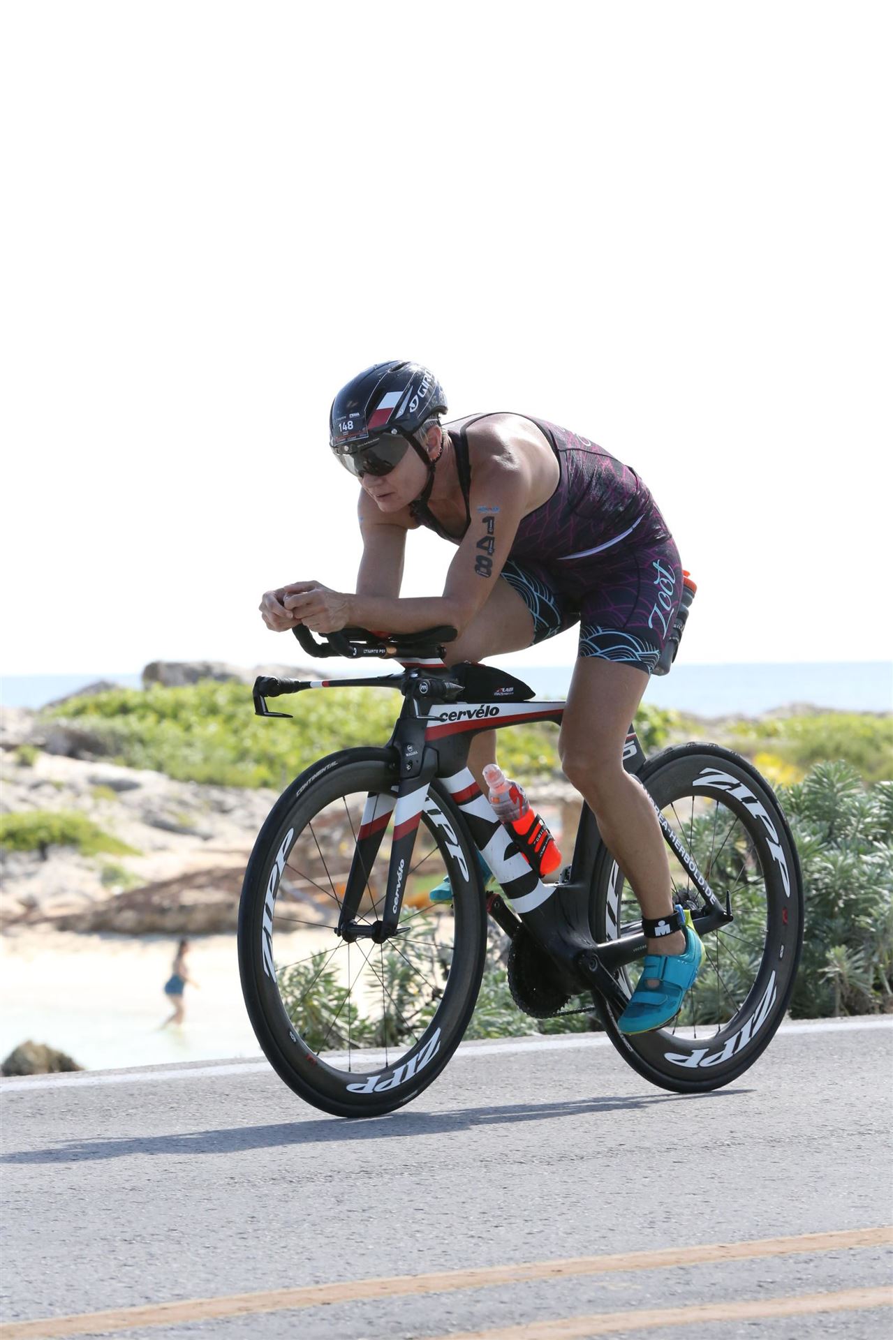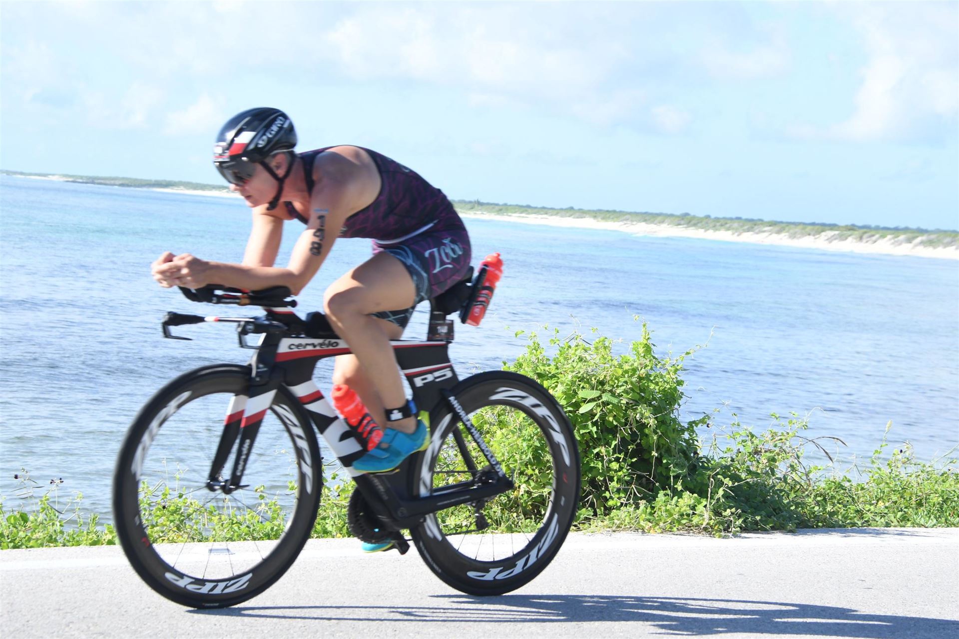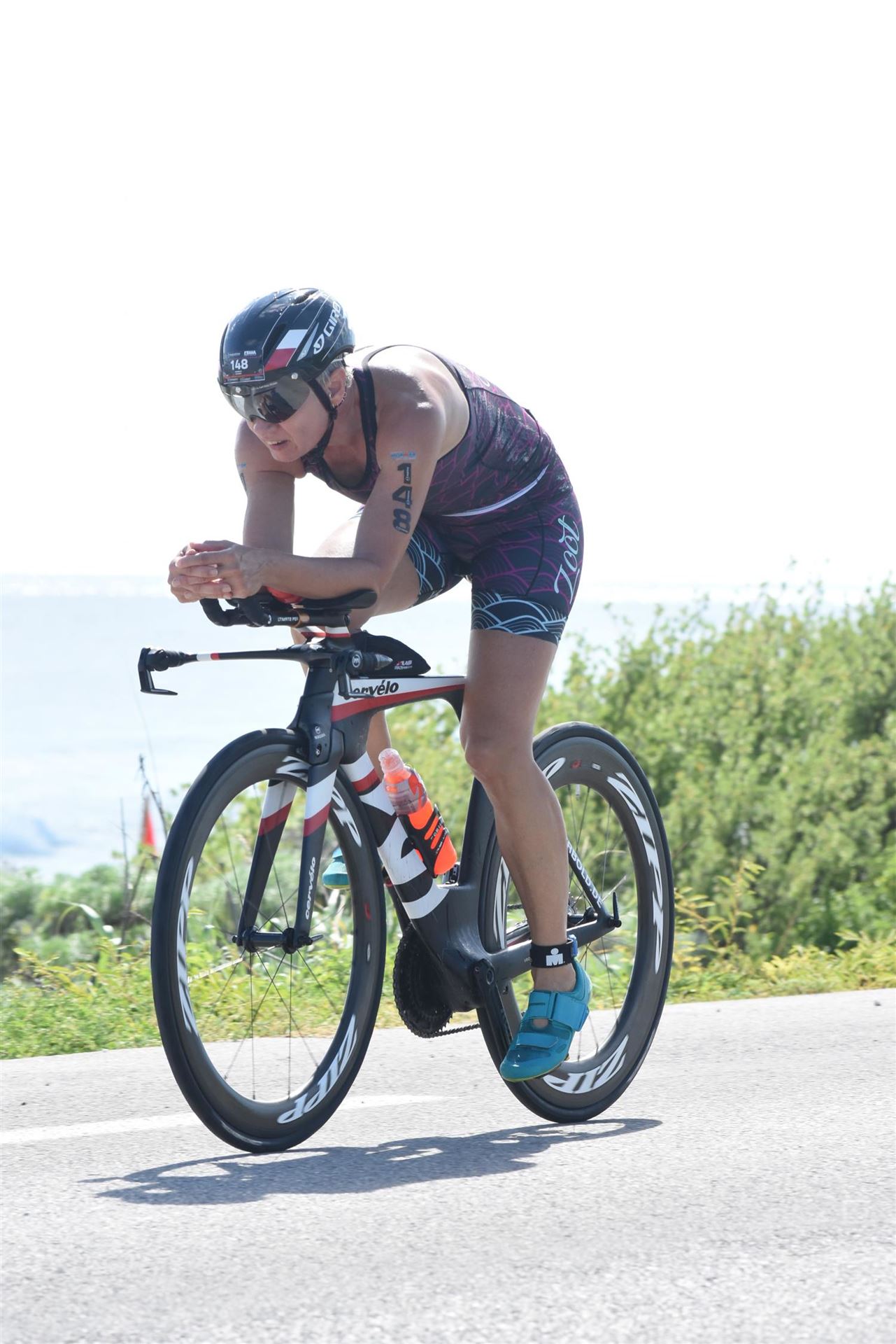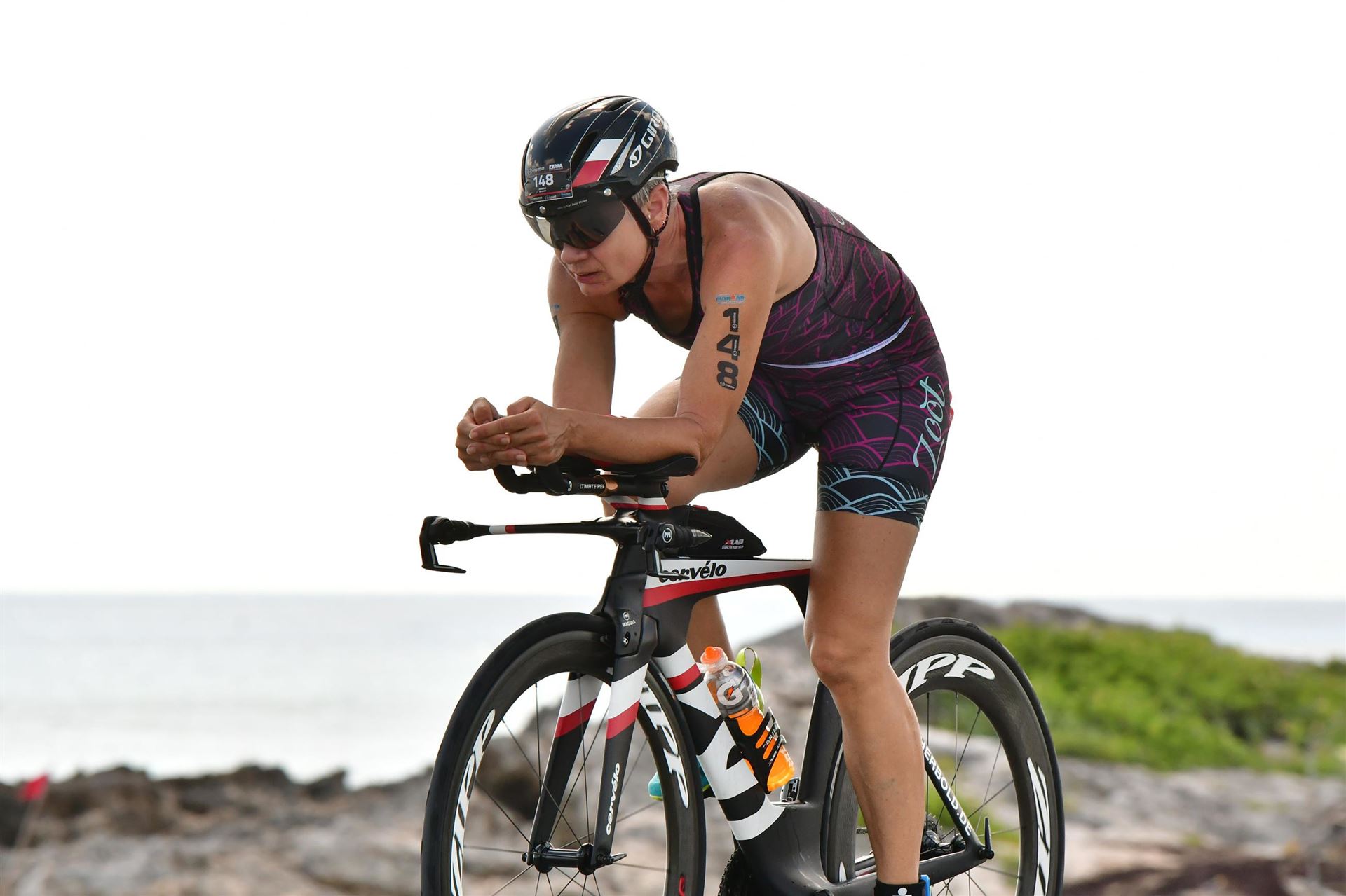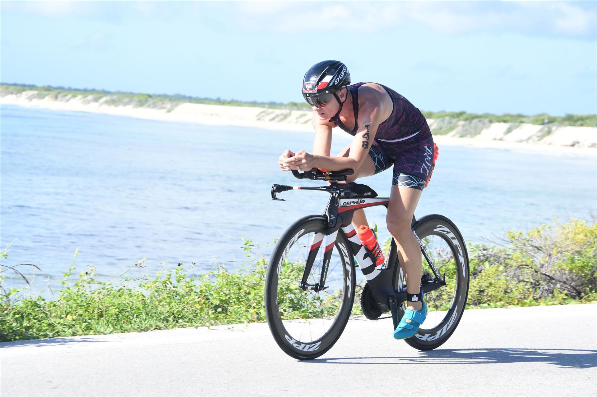 Zügig zum Rad und dann ab auf die erste Runde. Da mein Magen noch immer rebelliert verzichte ich die erste Zeit auf jegliche Nahrungs- bzw. Flüssigkeitsaufnahme. Das erste Stück geht an diversen Hotels und Restaurants vorbei. Die Strecke ist überwiegend geradeaus. Nichts spektakuläres. Ein großes Teilstück verläuft parallel zum Meer, der Ausblick ist einfach toll. Schön, wenn man während einem Rennen noch solch ein Panorama genießen kann. Am Anfang ist die Radstrecke noch etwas voll, das wird jedoch von Kilometer zu Kilometer besser. Ich fühle mich sehr gut und kann mein Tempo fahren. Ich freue mich, wenn ich den ein- oder anderen Athleten überholen kann, das bringt zusätzliche Motivation. Ich versuche die meiste Zeit abgelegt zu fahren, das minimiert den Windwiderstand. Die Verpflegungsstellen sind sehr dicht beieinander, man kann seine Flaschen auffüllen und sich mit Wasser kühlen. Ist perfekt organisiert. Insgesamt muss man 3 Runden fahren. 2 x 63 Kilometer und die letzte Runde noch 54 Kilometer. Ich versuche möglichst konstant mein Tempo zu fahren und fühle mich ausgezeichnet. Es steht ja im Anschluss noch ein Marathon an. Das Gefühl ist toll, als ich nach 3 Runden in Richtung Wechselzone abbiegen kann und bin erstaunt, wie viele erst jetzt auf die 3. Runde gehen. Schnell das TT Bike an einen Helfer abgeben und dann mit dem Laufbeutel ins Wechselzelt. Meine Radzeit von 5:30:34 ist eine tolle Zeit für mich.