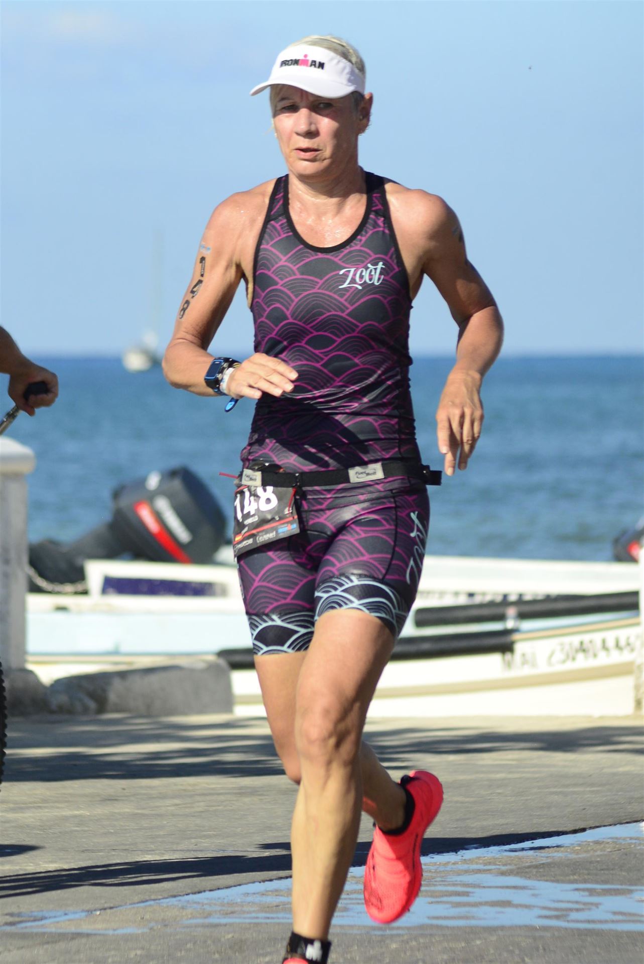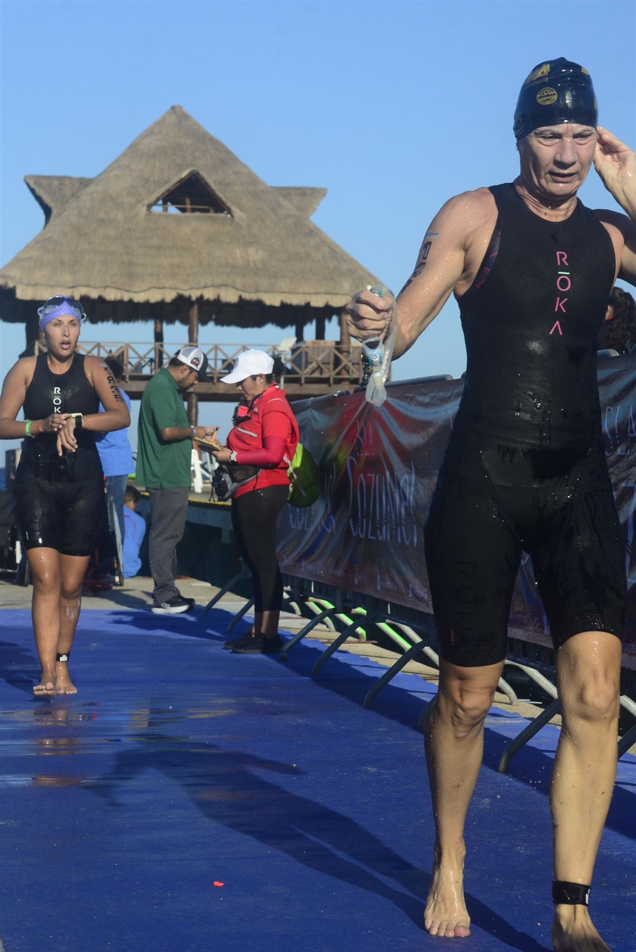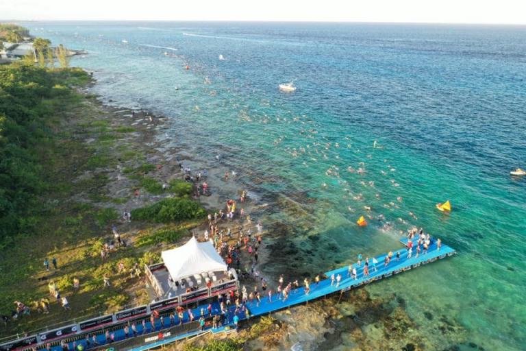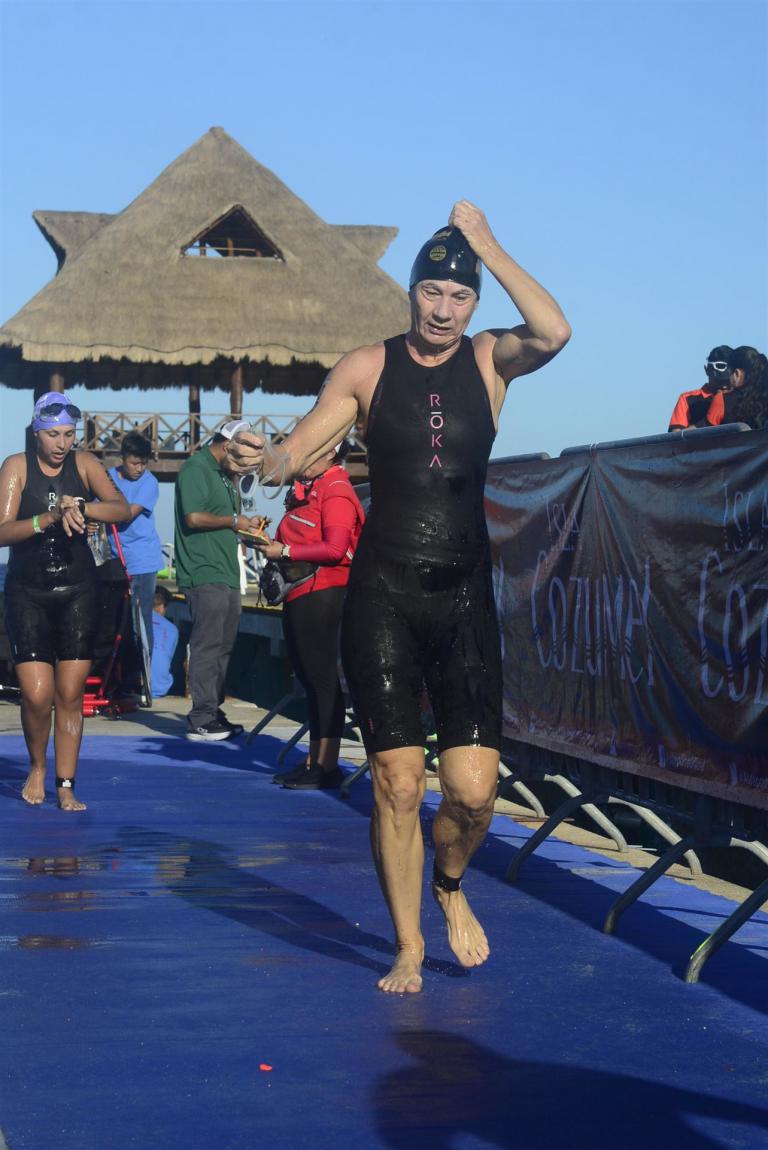Ab 7:30 Uhr gehen die Agegrouper ins Wasser. Durch den Rollingstart gibt es kein Gedränge. Ich gehe circa um 7:42 Uhr ins Wasser. Es liegen 3,8 km im Meer schwimmen vor mir. Die Wellen meinen es an diesem Morgen gut mit mir. Der Seegang ist verhalten, meine Übelkeit erträglich. Man hat das Gefühl, man schwimmt in einem Aquarium. Man hat eine tolle Sicht. Ab und an sieht man einen Taucher am Meeresboden. Sicherheit wird groß geschrieben. Zumal aufgrund der Wassertemperatur ohne Neo geschwommen wird. Es gibt eine leichte Strömung, was die Schwimmzeit um einiges verkürzt. Die Strecke ist gut markiert, es geht 3.800 Meter in eine Richtung. Nach 1:06:04 steige ich aus dem Wasser.