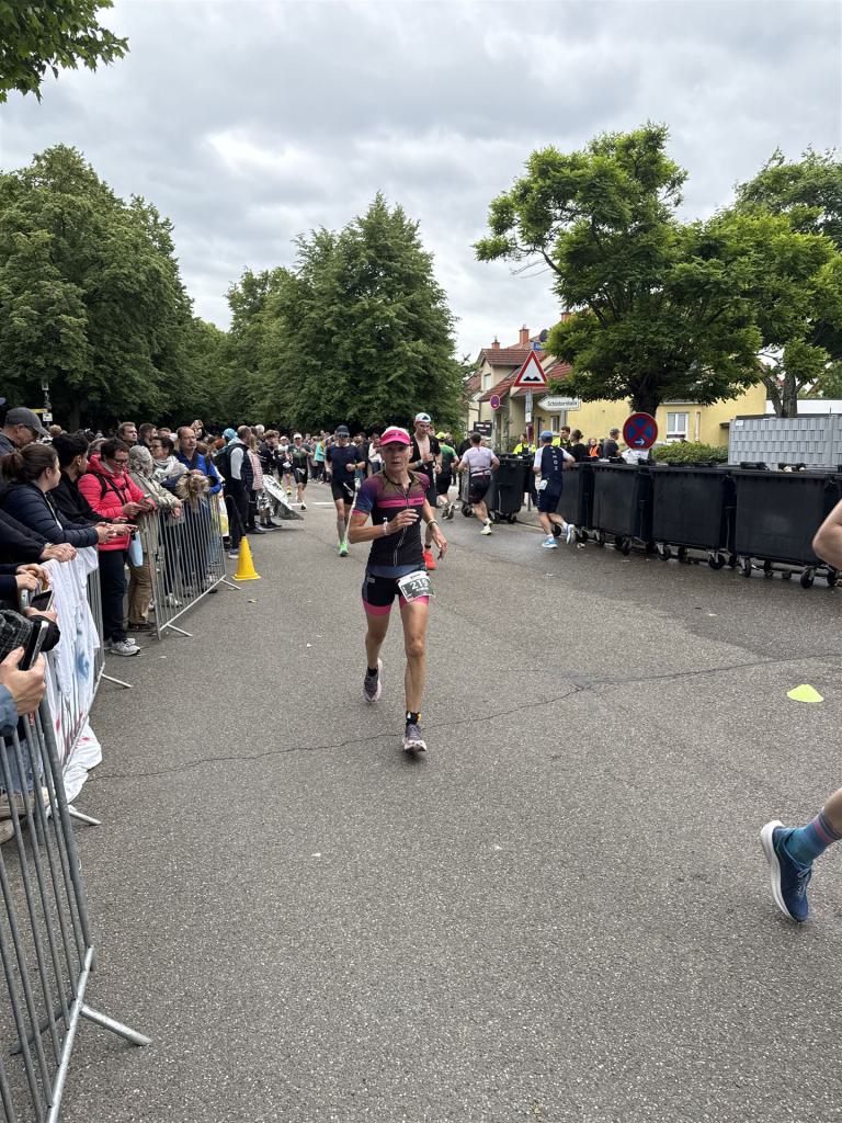 Nach 40:07 Min. komme ich aus dem Wasser und laufe in die Wechselzone T1.